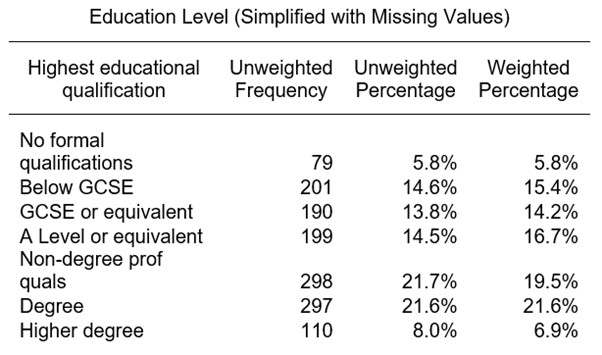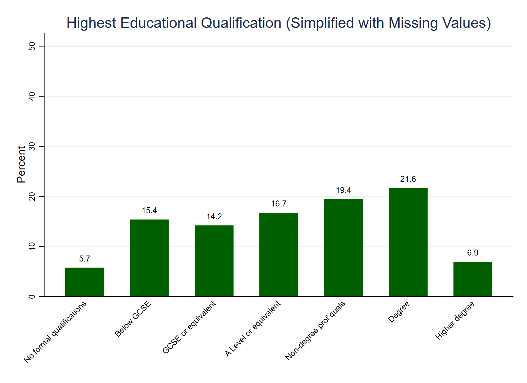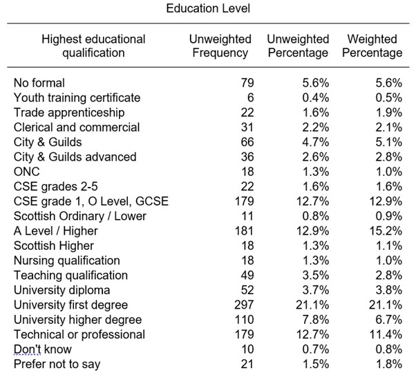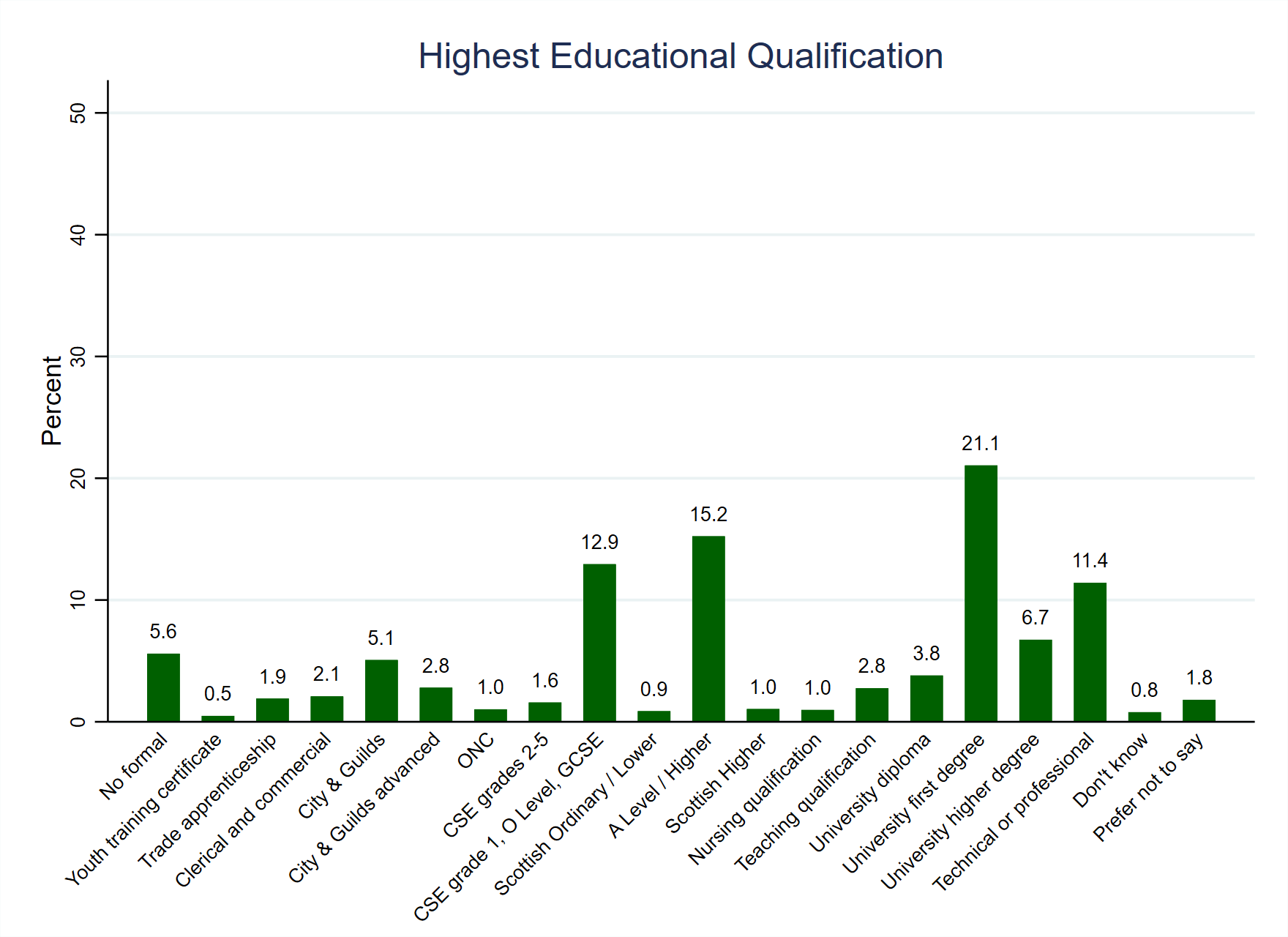 The education level variable indicates the highest educational qualifications obtained by respondents. Weights are applied in Figure 1, which shows that the largest group is respondents with first degrees (21.1%), followed by those with A Levels or equivalent (15.2%) and those with GCSEs or equivalent (12.9%). Together, these groups constitute almost half (49.2%) of all respondents. As noted with reference to survey representativeness, when compared to the 2011 census the sample overrepresents those with higher level qualifications (A-level and above) and concomitantly underrepresents those with lower level (GCSE or below) or no formal qualifications.