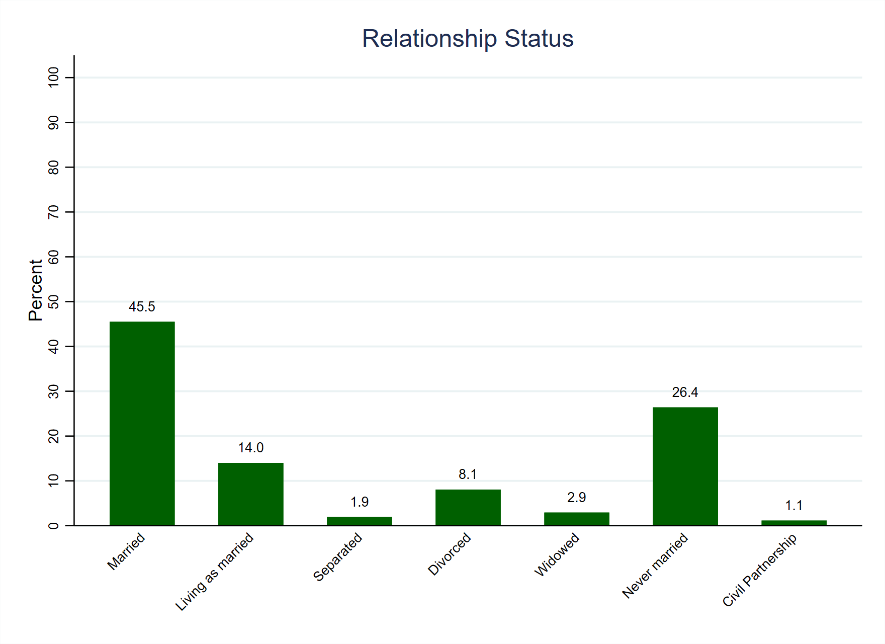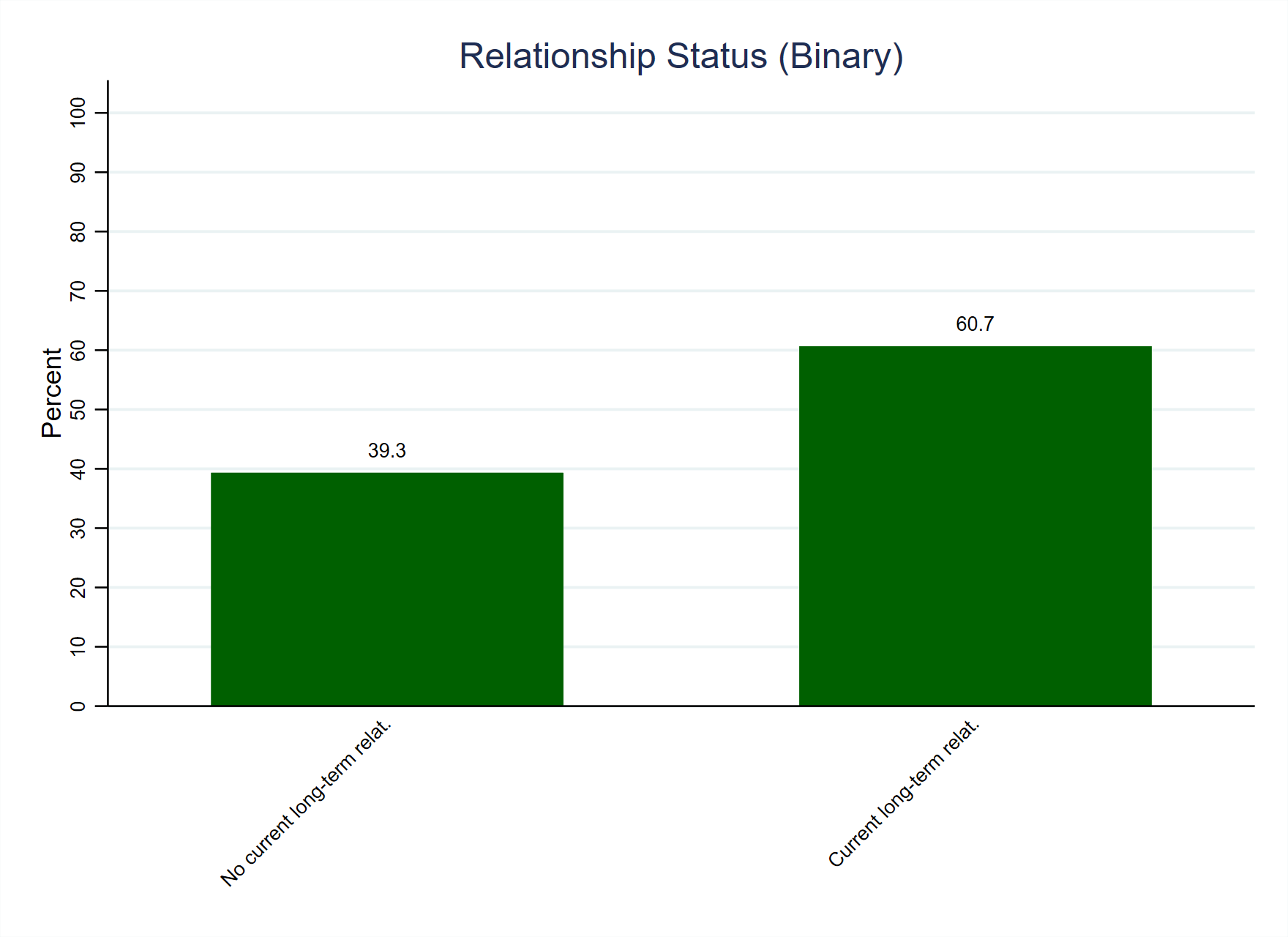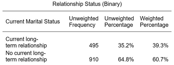 Figure 1 graphs the relationship status variable and shows that a plurality of respondents (45.5%) in the weighted sample are married, with the next largest group being the quarter of respondents (26.4%) who had never been married. There are no answers to be coded as missing values in the variable but it is helpful to recode it into a binary with categories for those who are or are not currently in a long-term relationship. The result of this recoding is presented in Figure 2, which shows that three fifths of respondents (60.7%) are in some form of long-term relationship. The details of the original and recoded variables are presented below Figure 2.