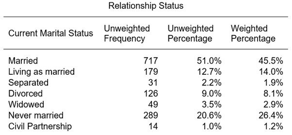 | New and old categories | ‘No current long-term relationship’ = ‘Separated’ + ‘Divorced’ + ‘Widowed’ + ‘Never married’ ‘Current long-term relationship’ = ‘Married’ + ‘Living as married’ + ‘Civil Partnership’ |