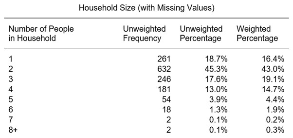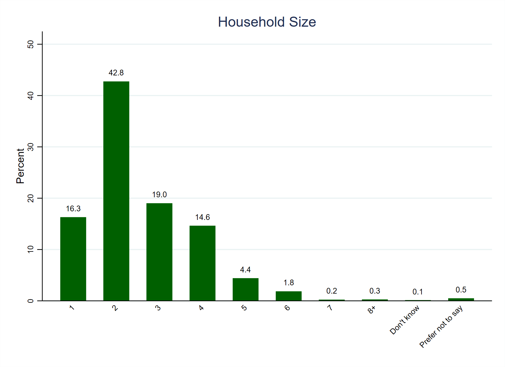 The household size variable indicates how many people live in respondents’ households and Figure 1 shows that slightly more than two fifths (42.8%) of the weighted sample live in two-person households. Further, slightly below one fifth (19.0%) live in three-person households, whilst approaching one third reside in either one-person (16.3%) or four-person (14.6%) households. Together, then, more than nine in ten (92.7%) respondents live in household of between one and four people. There is a very small group (0.6%, n = 9) who answered ‘Don’t know’ or ‘Prefer not to say’ to the question and are set as missing values in the recoded variable, which is graphed in Figure 2. The variable otherwise remains the same as the original and details of both are presented below Figure 2.