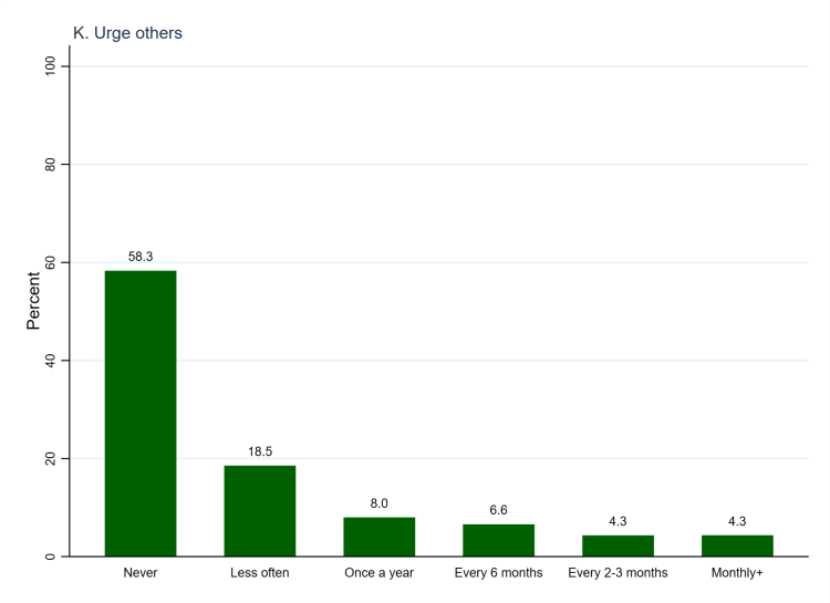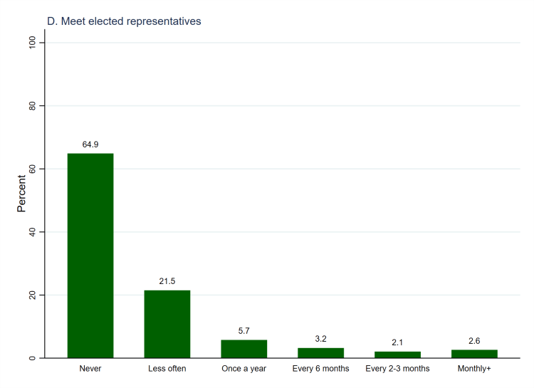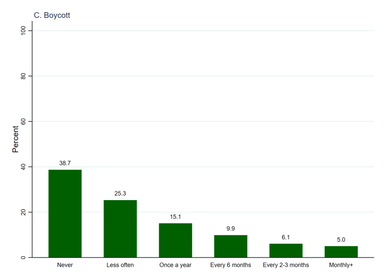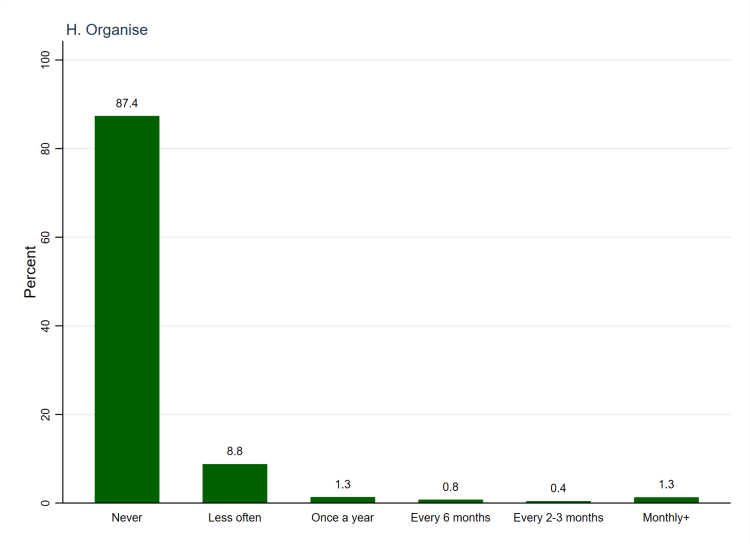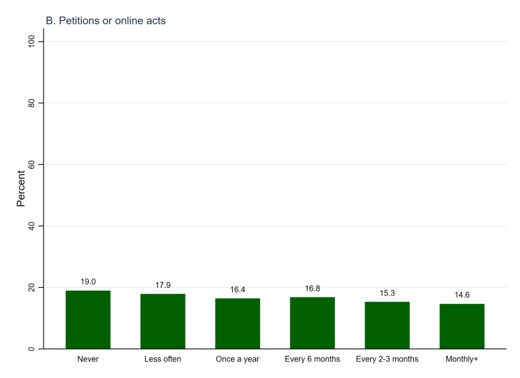 Having considered the voluntary official positions that citizens can hold, we now move onto the specific political (whether explicitly or implicitly so) acts that people can undertake. As shown in Figure 1 (above), which uses weighted data, there is quite some variation in the frequency with which people engage in such acts.[1] At one end of the spectrum we can see the flat distribution relating to signing petitions or taking online actions (Panel B), indicating that between one in five (19.0%) and one in seven (14.6%) of people do those things with each level of frequency (ranging from never to monthly or more often). At the other end of the spectrum is direct action (Panel G), which is only done with any frequency by one in eighteen people (5.7%). There is a general tendency in which the more demanding political acts are done less frequently by a greater proportion of people. Indeed, seven of the eleven acts that the survey asked about are never done by a majority of people.