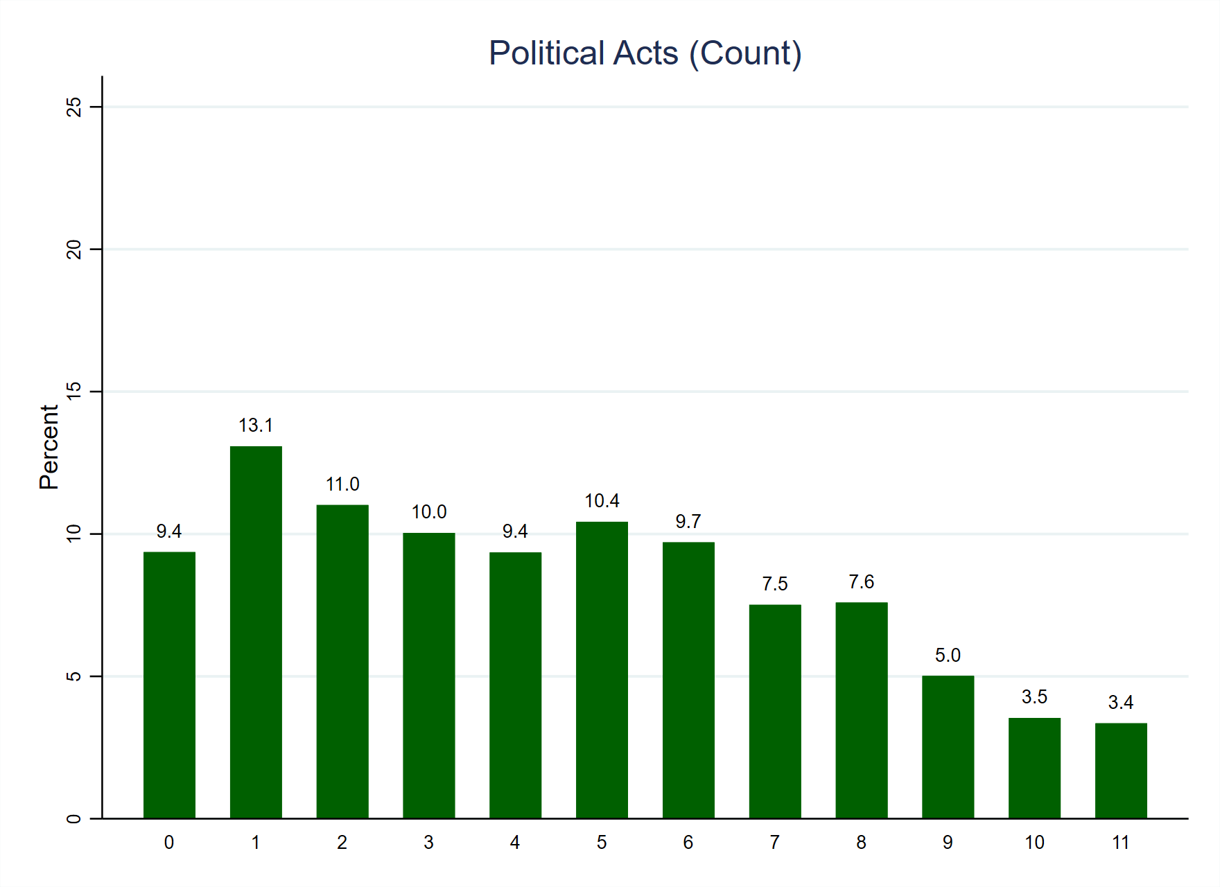 As with official positions, we can summarise these acts by calculating a variable counting the number of acts that each person ever undertakes (there are no missing values to exclude), and this is graphed (using weighted data) in Figure 2. The distribution is less steep than we might expect, and a small plurality (13.1%) only ever do one political act. A majority of people (52.9%) undertake four or fewer acts, but close to half (47.1%) undertake between five and eleven acts. The fact that at least some level of political activity is so widespread may indicate the rude health of democracy in pre-Brexit Britain. However, it also reflects the fact that surveys, and especially surveys of respondents drawn from online panels of volunteers (with quotas to ensure that they are representative of the population in terms of key demographic and political characteristics), tend to greatly over-sample politically active people. This is less problematic when we look at the relationships between variables, but it means that we should read these estimates (weighted or otherwise) of how much political activity was occurring in pre-Brexit Britain with caution.