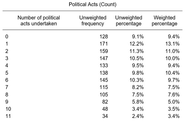 | Variable names | pp_paf_materials_ir, pp_paf_petitonlin_ir, pp_paf_boycott_ir, pp_paf_meetelecrep_ir, pp_paf_attmeet_ir, pp_paf_protest_ir, pp_paf_directact_ir, pp_paf_orgmeegro_ir, pp_paf_contpol_ir, pp_paf_contmed_ir, pp_paf_urge_ir |