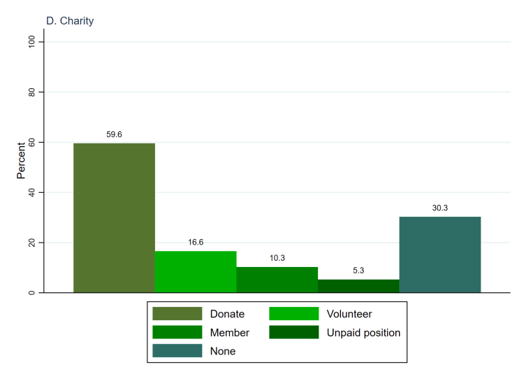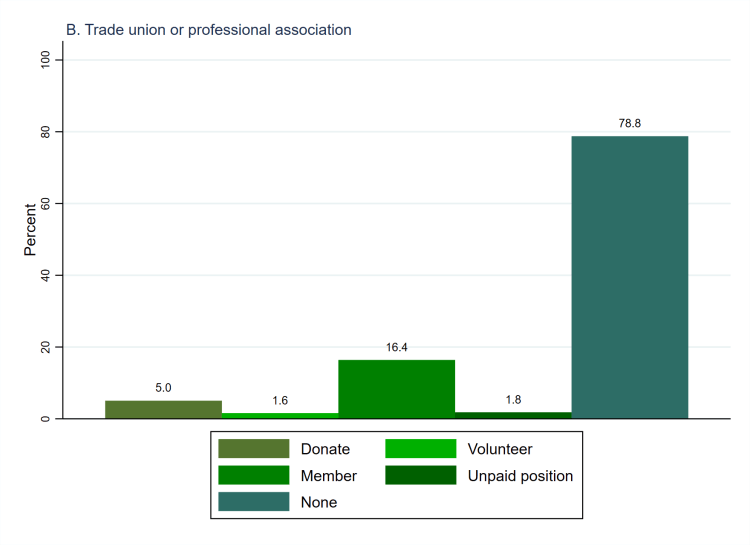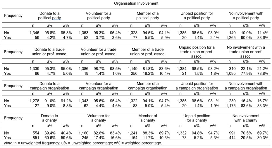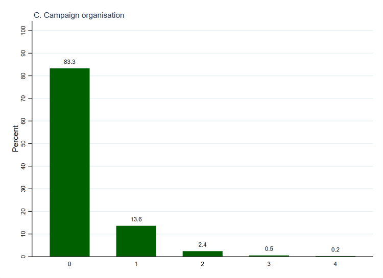 Beyond specific political acts, whether already done or prospective, people can have longer-term relationships with organisations that are more or less explicitly political in nature. Specifically, the survey asked about donating, volunteering, membership, and holding unpaid positions. As Figure 1 (above) shows, those activities were asked about in relation to political parties (panel A), trade unions and professional associations (panel B), campaign organisations (panel C), and charities (panel D).[1] For all types of organisation except charities, four fifths or more of respondents indicate that they are not involved in any of the ways asked about. Indeed, with the exception of being a member of a trade union or professional association (16.9%), less than one in ten people get involved in those ways. By contrast, less than one third (30.3%) of people indicate that they do not get involved with charities, and a majority (59.6%) indicate that they donate to such organisations. Charities are the least explicitly political organisations that the survey asked about (though this varies between organisations), so it seems that people are more inclined to support less overtly political causes.