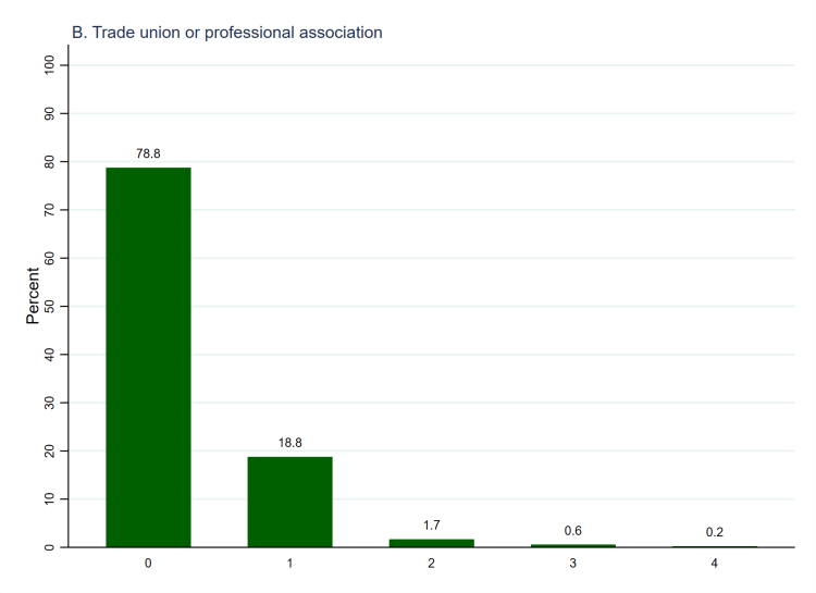 Again, we can look at the data differently by counting the number of ways that people are involved with each type of organisation. The results of doing so are shown in Figure 2 (below, using weighted data) and tell a similar story.[2] Of course, the percentages who are not involved with each type of organisation are identical in both figures, but we can also see that most people who get involved only do so in one way. The percentages who get involved in two or more ways are very small for political parties (2.7%, panel A), trade unions and professional associations (2.5%, panel B), and campaign organisations (3.1%, panel C). Even for charities (panel D), around one in seven (14.4%) get involved in two or more ways despite the fact, noted above, that a majority of people donate to charities. Given that the survey sample is likely to over-represent people who are active in more or less explicitly political activities, these results indicate that a very small percentage of the population are actively involved in any organisations other than charities, and especially in terms of getting involved in multiple ways. This may be, in part, because the kinds of involvement asked about entail a greater commitment of time or money to an organisation than specific political acts asked about previously.