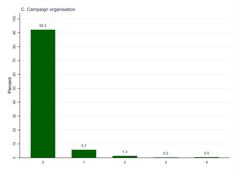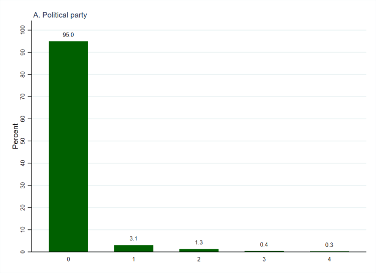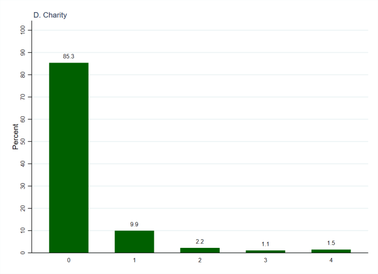 Again, the data can be recoded to show the count of skills-based activities that respondents undertake for each type of organisation, as has been done in Figure 2 (below, again using weighted data).[2] The columns representing zero activities are exactly the same as those in Figure 1 but Figure 2 additionally shows that most people who undertake any activities only undertake one of them. In all cases, the percentage who undertake one activity is at least twice the size of the total who undertake two, three, and four activities. For charities (panel D) almost one in ten (9.9%) respondents undertake one activity, whilst the figure is close to half that (or less) for the other types of organisation. Together with the figures relating to organisational involvement, this shows that charities are the most successful organisations at both gaining initial support (through donation, volunteering, membership, and taking on unpaid positions) and translating that support into specific skills-based activities.