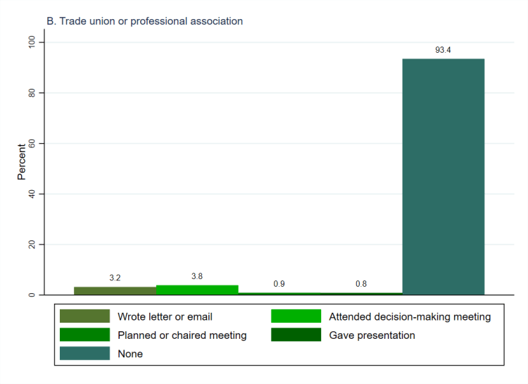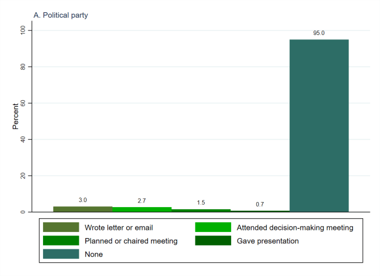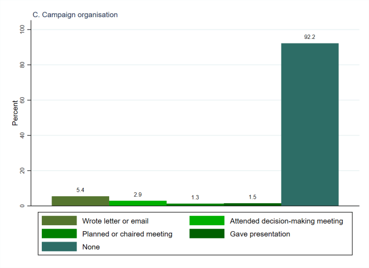 Drawing on Verba, Schlozman and Brady’s (1995) seminal Civic Voluntarism Model, the survey asked people whether they had done any activities involving particular skills for the organisations that they supported. This was to see whether (and how many) people utilise and sustain civic skills when getting involved with the organisations that they support. Specifically, they were asked whether they had written a formal letter or email for the organisation, attended a decision-making meeting, planned or chaired a meeting, or given a presentation. The questions were asked to all respondents who indicated that they had supported each type of organisation in any way but the variables used here include all respondents. The people who indicated that they didn’t support that type of organisation in any way are coded as not having undertaken any skills-based activities for them. As such, Figure 1 (above, using weighted data) shows that for all four types of organisation the overwhelming majority of people have undertaken none of the specific skills-based activities that were asked about.[1] Charities (panel D) are the type of organisation for which people are most inclined to undertake such activities but, even so, more than five in six (85.3%) have not done so. For the other types of organisation (political parties, panel A; trade unions or professional associations, panel B; campaigning organisations, panel C), more than nine in ten have not done any of the activities. It should be noted that only the ‘None’ category is mutually exclusive with the others, since respondents could indicate that they had done multiple activities, which is why the columns do not total 100%.