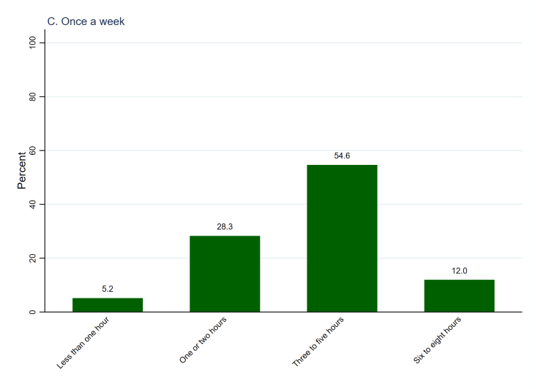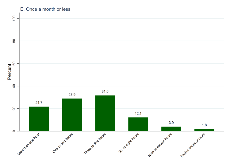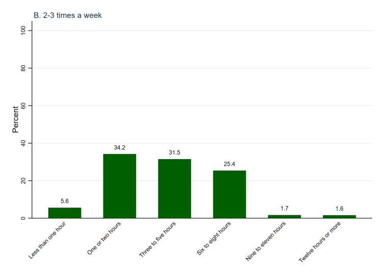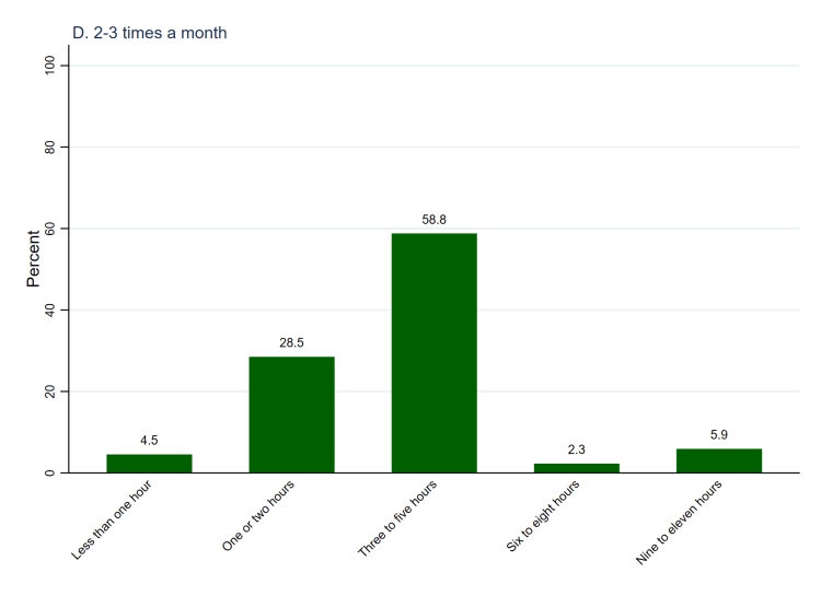 Without needing to recode the variables, we can look at how the time spent breaks down by each category of frequency of volunteering, as shown in Figure 3 (below, also using weighted data). The amount of time given does not vary greatly by the frequency with which people volunteer. In all but one category of frequency (2-3 times a week, panel B), a plurality give between three and five hours each time they volunteer. One or two hours is generally the next largest category, although those who volunteer daily are very committed; two fifths of them (40.5%) give up six or more hours every time they volunteer.[2] With the exception of this group, most people who volunteer do so every now and then, and tend to give up a couple of hours or a morning or afternoon. As with donating, however, the number of people who engage in such activities means that political parties, trade unions and professional associations, campaign organisations, and charities receive a very large number of voluntary hours from their supporters.