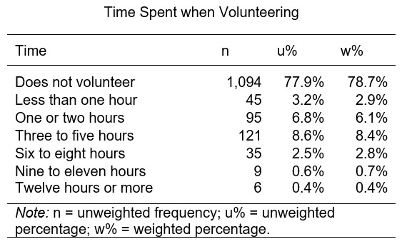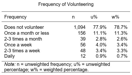 [2] Though we are dealing with a very small number of people; only 12 respondents (0.9% of the sample) indicated that they volunteered daily.
