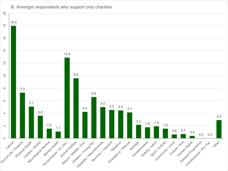 When considering the answers given by all respondents (panel A) it is clear that organisations working on cancer research and care are the most popular (14.6% of all organisations listed), closely followed by humanitarian and international development organisations (12.6% of all organisations listed). Combined, the categories covering health issues encompass three in ten (30.3%) of all the organisations listed. Further, if we combined the category relating to animal welfare with the category covering nature, wildlife, and the environment then it becomes the second biggest category (16.3% of all organisations listed) after the combined health category. The distribution of organisations supported looks very similar if we focus on the answers of respondents who said that they only support charities (panel B). The most notable change is the decline in the percentage of organisations falling into the ‘Nature / Wildlife / Env.’ category, which indicatives that organisations like Greenpeace and Friends of the Earth (FoE) are considered by many to be campaign organisations rather than charities. That said, a small number of respondents listed the same organisations as both the campaigning organisations and the charities that they supported, and a smaller group explicitly commented on the blurred boundary between the two types of organisation.