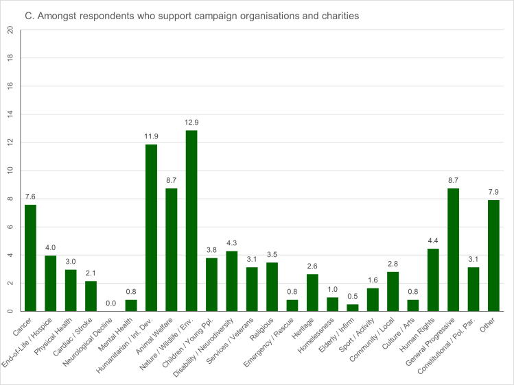 Those respondents who indicated that they supported a campaign organisation or a charity (or both) were given the opportunity to write the organisation(s) that they support into an open text box. Far more people (n = 980) indicated that they supported charities than campaign organisations (n = 220), and almost all of those who supported the latter also supported the former (n = 202). Some people listed multiple campaign organisations or charities (or both) that they supported. Their answers were coded into 24 categories, with details provided in the table at the bottom of this post. Figure 1 (above, using unweighted data) shows the percentage of all organisations listed that fall into each category: panel A does so for all organisations listed by all respondents; panel B shows the breakdown for organisations listed by respondents who only support charities; panel C shows the distribution amongst respondents who support both campaign organisations and charities.
