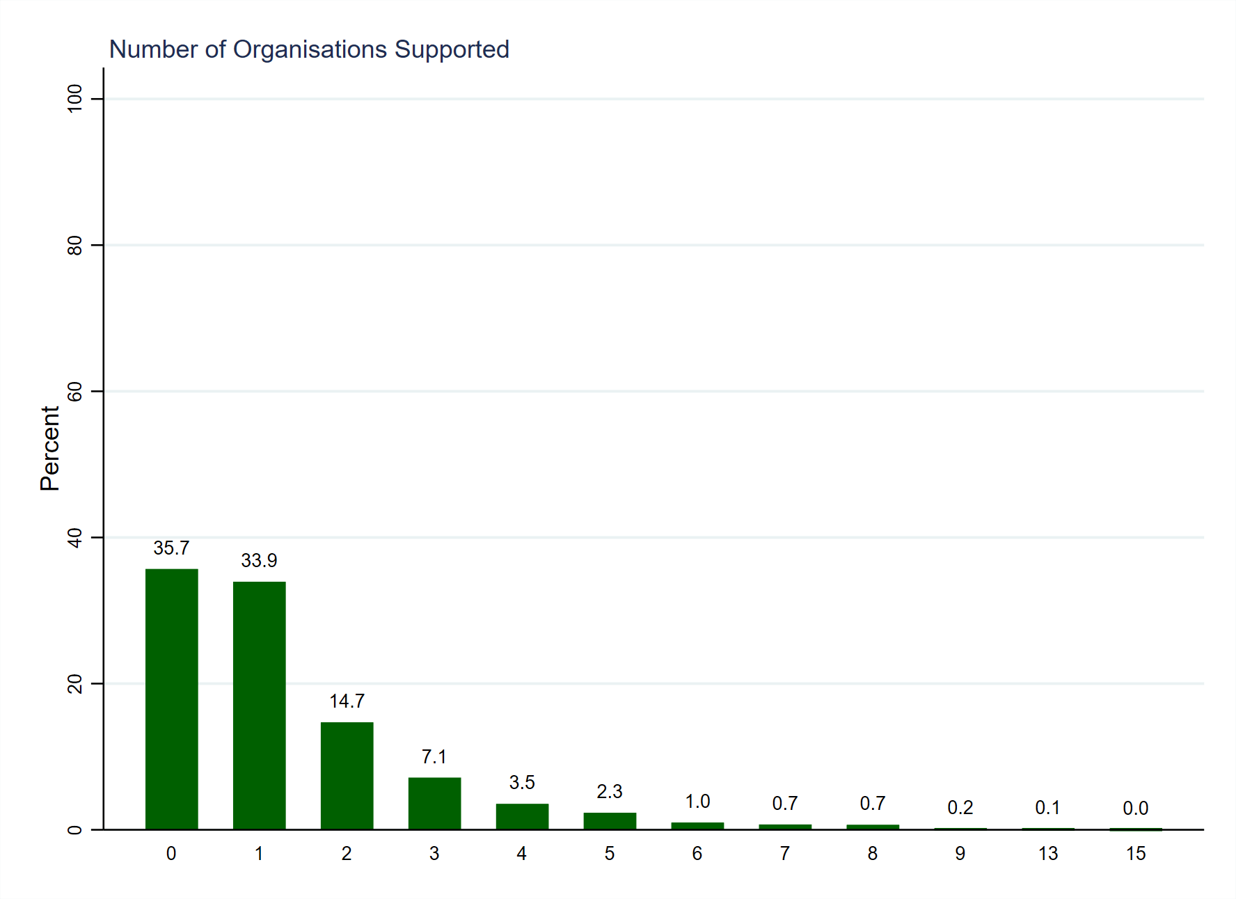 We can also look at the number of organisations that people support, as shown in Figure 2 (below, using weighted data). More than a third (35.7%) do not list any specific organisation that they support, though almost as many (33.9%) list one. Less than half as many (14.7%) list two organisations that they support, half as many again (7.1%) list three, and half as many again (3.5%) list four. Thus, although the modal category is zero, a clear majority of people list at least one organisation that they support (64.3%) and more than half (55.7%) support between one and three. A further group (4.4%) indicated that they didn’t know, couldn’t remember, or were unwilling to list the campaigning organisations or charities (or both) that they support, or listed organisations that could not be identified. Additionally, some people (2.5%) indicated that they support various or multiple organisations (without listing them), or that they put money in any collection tins that they see. Thus, more people support organisations than are willing or able to list the specific ones that they favour. However, this comes with the familiar caveat that respondents to surveys, and especially quota surveys of respondents from voluntary online panels, are more politically engaged than the population at large and therefore likely to indicate more widespread support for organisations.