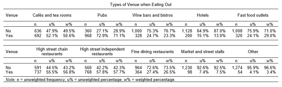 The least popular venues are market and street stalls,[1] which fewer than one in every thirteen people (7.5%) ever visit. These are followed by hotels (13.0% visit them to eat), wine bars and bistros (23.3%), and fine dining restaurants (26.5%). This means that fast food outlets are the middle option in terms of popularity, with around one in three people (29.0%) indicating that they eat at them. As with cultural activities, there is no clear pattern in which ‘legitimate’ venues (which are held in high esteem and seen as worthy), such as fine dining restaurants and bistros, are the least popular eateries. Indeed, they are both quite similar to fast food outlets in terms of their popularity, though it remains to be seen whether the same people go to both.