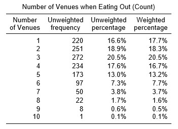 | New and old categories | Category 1 (‘Yes’) on each of the original variables was counted as 1 (i.e. indicating that the type of eatery is visited), with category 0 (‘No’) counted as zero. As such, 1 on the new variable indicates that only one type of venue is visited when eating out (respondents who don’t eat out were not asked this question, which is why there are no zero (0) answers), whilst 10 indicates that all of the venues are visited at least occasionally. |