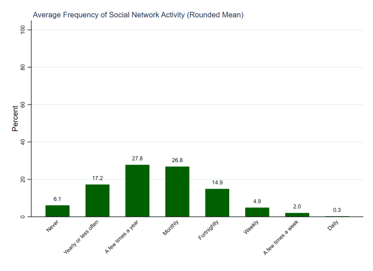It remains to be seen whether frequency of interaction with different groups is related such that people who interact with their friends with high frequency are also more likely to interact often with their neighbours and colleagues. However, we can observe the average frequency of interaction with friends, at home and when going out, and colleagues (talking to neighbours is excluded because it has different answer categories). This is displayed in Figure 2 (below, also using weighted data), which shows that more than half of respondents (54.6%) interact with their friends and colleagues, on average, a few times a year or monthly. It is also the case that around half of people (48.9%) interact with their friends and colleagues at least monthly, on average, whilst the other half (51.1%) do so less often. Thus, on average, people have moderately frequent interaction with their acquaintances, rather than very frequent or infrequent interaction.