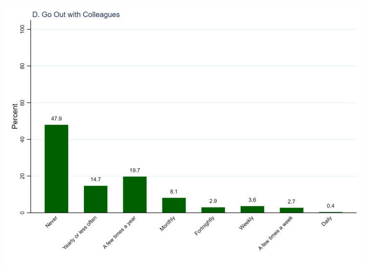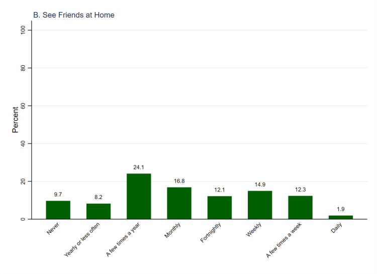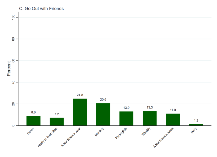 Perhaps more surprisingly, people most frequently socialise with their neighbours. However, the questions do not indicate the intensity of the interactions and can safely assume that interactions with neighbours is less intimate than are interactions with friends. In other words, people probably say a passing ‘hello’ to a neighbour on most days, which may account for the high frequency of interaction (though they may also have more extended conversations too). Beyond this lack of clarity regarding the quality of interactions, the questions also impose boundaries between neighbours, friends, and colleagues that may be blurred. It is possible that neighbours and colleagues become friends, and we do not know how much the groups overlap. This is most important in relation to the assumption that people who do not work also no longer see their colleagues (hence not being asked about the frequency of such interactions). We might assume that people who still see colleagues after ceasing to work with them must consider them to be friends, but perhaps this is not the case.