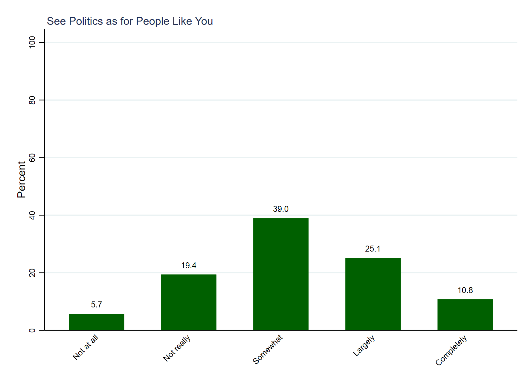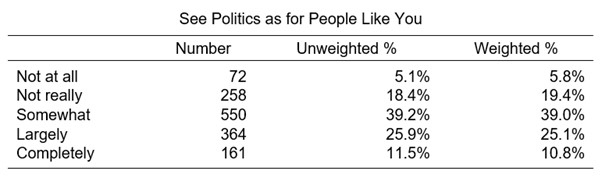 For now, we can observe the answers to the question of whether politics is for ‘people like you.’ Figure 1 (above, using weighted data) shows that almost two fifths (39.0%, a plurality) opt for the middle answer of ‘Somewhat’ when this question is posed. The distribution is then approximately normally distributed around that option, though a more than a third of people (35.9%) indicate that politics is for people like them whilst a quarter (25.1%) indicate that it is not. Thus, people tend to have a middling assessment of whether politics is for people like them but err on the positive side when departing from the middle option.