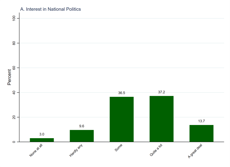 The questions about interest in politics asked about both the national and the local level. As Figure 1 (above, using weighted data) shows, the distributions of answers differ noticeably depending on the level.[1] More than half of people (50.9%) say that they have quite a lot (37.2%) or a great deal (13.7%) of interest in national politics (panel A), whilst only one in eight (13.6%) say that they have hardly any (9.6%) or no (3.0%) interest. By contrast, for local politics (panel B), a quarter (24.5%) report quite a lot (18.7%) or a great deal (5.8%) of interest but more than a third (35.2%) report hardly any (29.1%) or no (6.1%) interest. In both cases, the middle option (some interest) is selected by a plurality, but slightly more people (40.4%) do so in relation to local politics than national politics (36.5%).