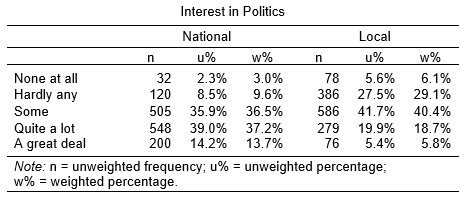 Overall, people are considerably more interested in national politics than local politics, but levels of interest are generally high. Around two thirds of people (64.9%) profess at least some interest in local politics, whilst approaching nine in ten (87.4%) do so in relation to national politics. These figures are almost certainly a reflection of the higher level of political engagement that is observed amongst online panels of voluntary survey respondents, even when a representative sample is drawn from amongst them, than in the general population. It is also the case that some people might feel the need to overstate their interest in politics because it is seen as worthwhile, though this is less likely in an online survey because the urge to conform to social expectations is weaker than when not being asked questions by a person. Nevertheless, we can safely conclude that interest in politics is not niche; a large number of people in the population have at least a moderate interest in the topic. The extent to which this interest translates into political activity remains to be seen and will be investigated subsequently.