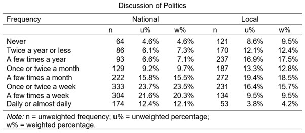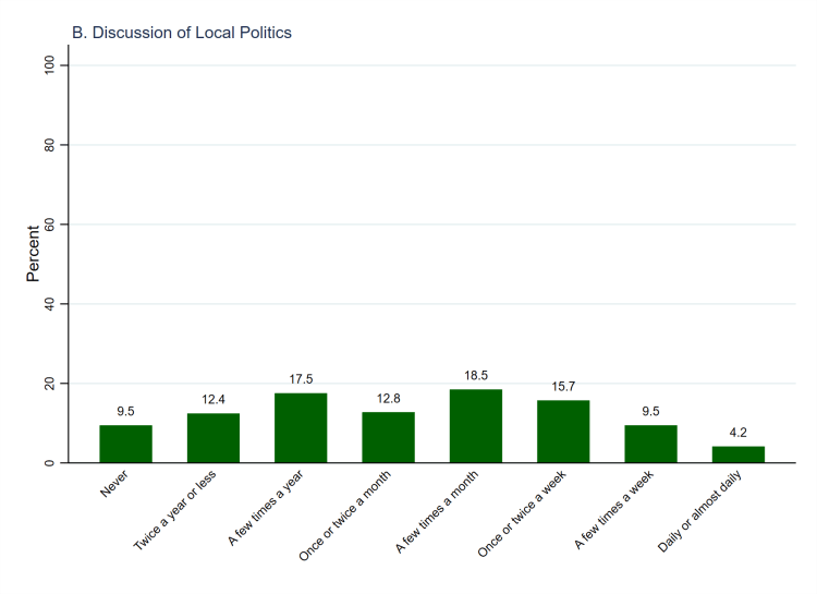Respondents were asked how often they discuss national and local politics, and their answers are presented in Figure 1 (above, using weighted data).[1] Starting with national politics (panel A), more than half of people (55.9%) say that they discuss it at least once a week whilst four fifths (81.1%) do so at least once a month, meaning that one fifth (18.9%) discuss national politics a few times a year or less. By contrast two fifths of people (39.4%) discuss local politics (panel B) a few times a year or less, three fifths (60.6%) do so at least once a month, and less than a third (29.4%) do so at least once a week. Clearly, then, people discuss national politics more frequently than local politics, though the latter is also discussed with at least moderate frequency by a clear majority of people.
