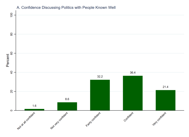 Widespread discussion of politics, however, does not necessarily imply ease with the subject. As such, the survey also asked how confident people feel about discussing politics with people who they know well and people who they do not know well. The answers to these questions are presented in Figure 2 (below, also using weighted data) and show that people are generally confident discussing politics with people who they know well (panel A).[2] In relation to such discussions, approaching three fifths of people (57.8%) say that they are confident (36.4%, a plurality) or very confident (21.4%), and just under nine in ten (89.8%) are at least fairly confident. The picture changes somewhat for discussion of politics with people are not known well, and almost three in ten people (29.6%) say that they are not very confident (21.1%) or not at all confident (8.5%) doing so. A similar proportion (31.7%) say that they are confident (25.6%) or very confident (6.1%) doing so, but the single largest group is those who are fairly confident (38.6%, almost two fifths). Unsurprisingly, then, people are notably more confident discussing politics with people who they know well than with people who they do not know well, although levels of confidence are at least moderate in relation to both groups.