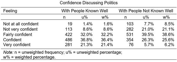 The high frequency of discussing politics, and of confidence in doing so may, again, reflect the fact that online samples of voluntary respondents, even if chosen to be representative, are likely to have higher levels of political engagement than the population at large. Nevertheless, discussion of politics, as with interest in the topic, is not a niche activity, and people are generally comfortable discussing the topic with people who they know well. It will be interesting to see, however, what other factors relate to both the frequency of, and confidence in, discussing politics.