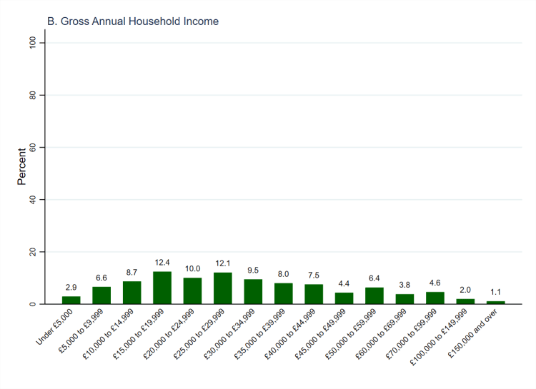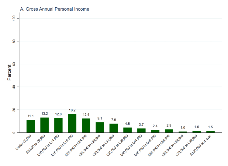 Within income, we can distinguish between what one earns personally, and the total amount earned within a household. The latter allows us to take account of the fact that someone may not earn an income personally but can still have access to considerable economic capital due to a large household income (e.g. if someone shares the income of a partner). The survey asked about both personal and household income, and the distributions of each can be seen in Figure 1 (above, using weighted data). More than half of people (53.3%) have gross annual personal incomes (panel A) below £20,000, and the modal category is ‘£15,000 to £19,999’ (selected by 16.2%).[1] By contrast, household income (panel B) tends to be slightly higher, reflecting the fact that it can encompass multiple personal incomes.[2] We have to add all of the categories up to ‘£25,000 to £29.999’ together in order encompass half of people (52.7%). Further, the tail to the right of the distribution for household income, encompassing the higher categories of income, is longer and flatter than for personal income. Thus, unsurprisingly, people tend to have higher household than personal incomes.
