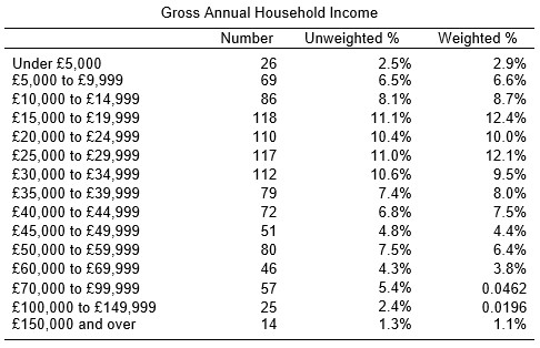 There is, however, a crucial caveat relating to income variables: people are often unwilling to provide information on their incomes, and income is viewed as a sensitive topic. For this reason, we see very high numbers of non-responses on both income variables: from a total sample of 1,405, 308 did not provide an answer in relation to personal income, and 343 did not provide an answer in relation to household income. This may be because they are uncomfortable providing the information or because they are not able to provide an accurate answer (especially in relation to household income, which may entail knowing multiple people’s incomes). Whatever the reasons, between a fifth and a quarter of respondents did not provide information about their incomes so we can be less confident of the distribution of this facet of economic capital than we are about other facets for which we have answers from all respondents.