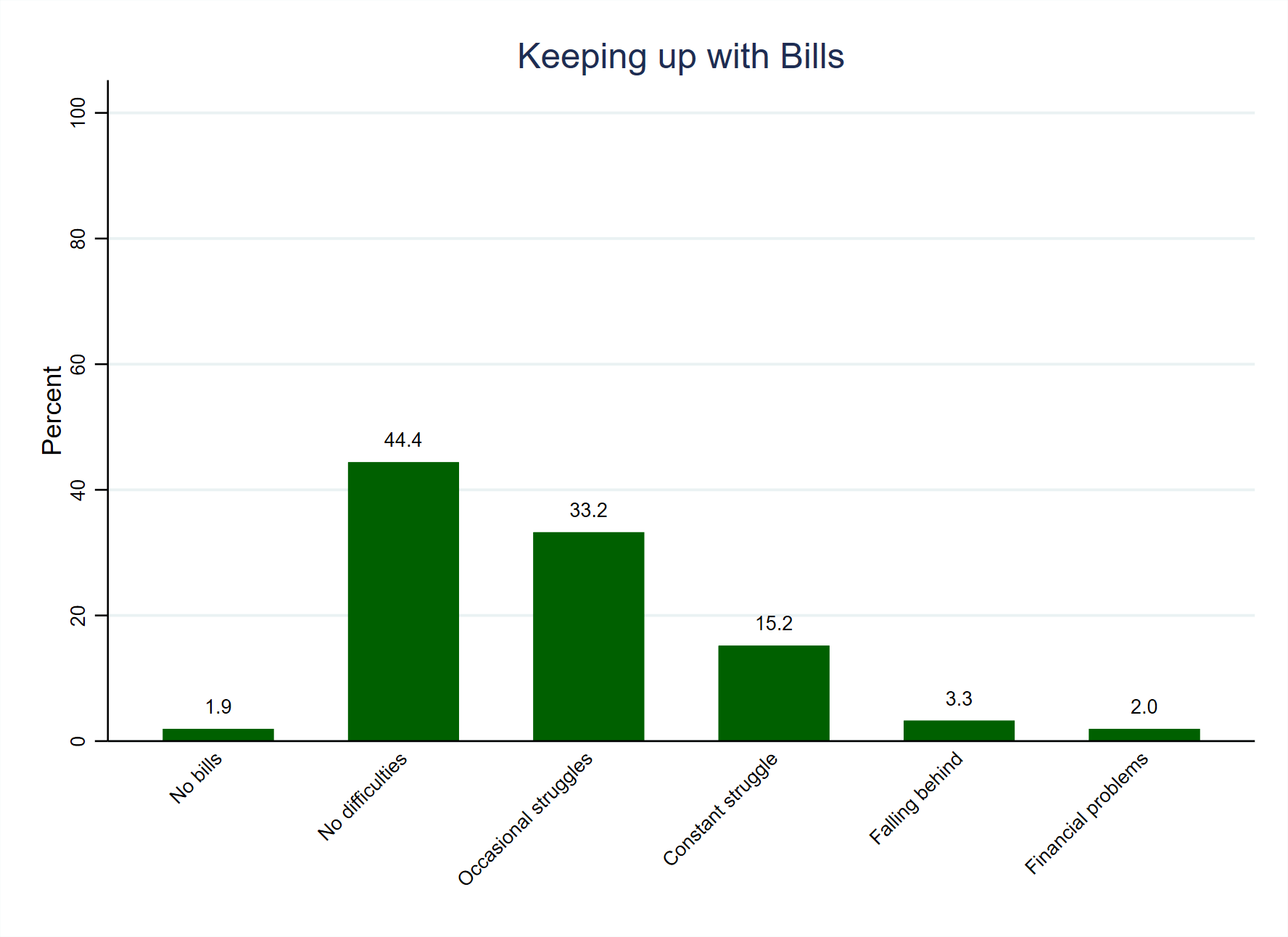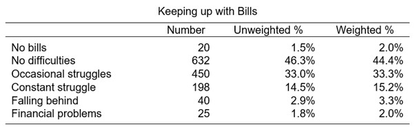 Importantly, the question does not define what constitutes ease or difficulty in keeping up with bills and payments, so there is an element of perception in the answers provided. In other words, people may have different levels of risk aversion or predispositions that lend themselves to states of higher or lower stress or worry. Thus, different people might assess the same financial situation as more or less difficult, and we cannot know the precise monetary situation of respondents from their answers. This is not to say, however, that the stresses and strains of feeling that one is struggling to keep up financially are not real, regardless of what the precise financial situation of each person is.