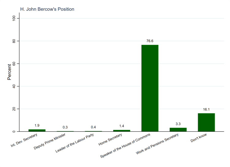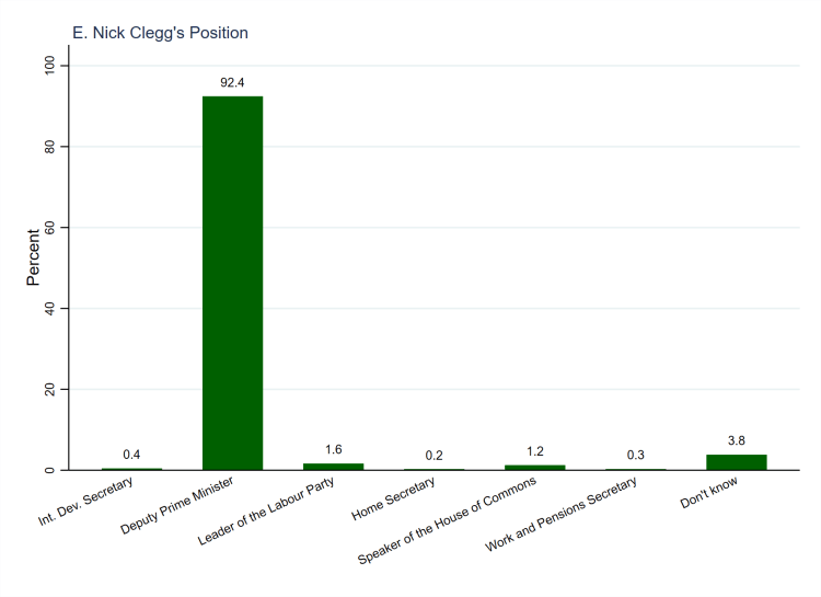 Figure 1 (above, using weighted data) shows that people are generally very familiar with the identities of politicians but less knowledgeable about questions relating to taking political action. When asked whether they could identify a local venue that could host a public meeting (panel A), more than two fifths (46.1%) think that they have an idea of such a place and three in ten (29.8%) definitely know of one. However, a fifth of people (22.6%) either don’t know of such a place or cannot think of one. Further, only one in seven people (14.3%) know that MPs are not required to reply to letters that they receive (even if it is good practice for them to do so), and a full third (33.4%) admit that they do not know. Turning to the task of identifying politicians, people generally fare much better, and almost three quarters (73.7%) can pick their local MP out of a list of names (panel C). Similar numbers could match Theresa May (75.9%, panel G) and John Bercow (76.6%, panel H) to their respective roles (Home Secretary, Speaker of the House of Commons) at the time, whilst nine in ten could match Ed Miliband (92.7%, panel D) and Nick Clegg (92.4%) to their roles (Leader of the Labour Party, Deputy Prime Minister). It was only Justine Greening (panel F) who people struggled to match to her role as International Development Secretary, with two fifths (40.2%) picking the correct answer but a slightly larger percentage (45.5%) indicating that they did not know her role.
