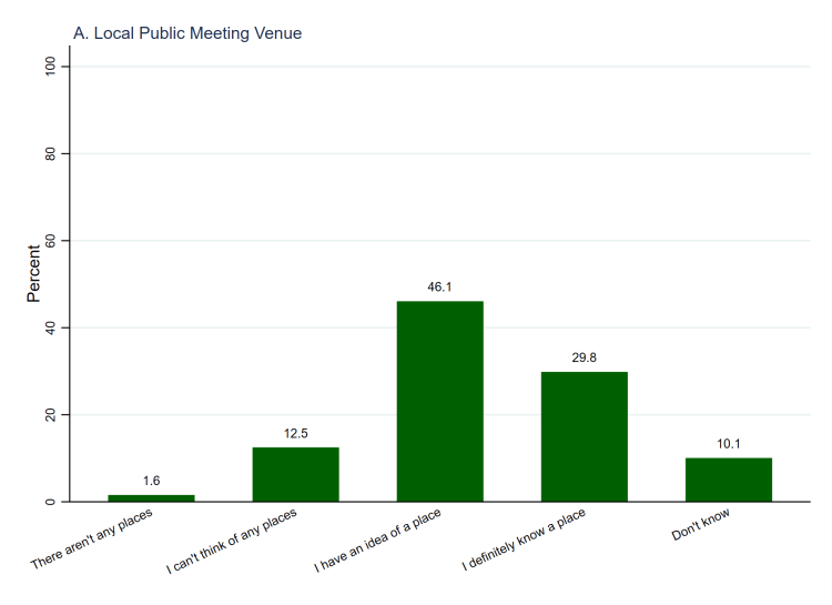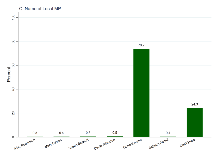 In addition to their appraisals of their own political knowledge, people’s actual political knowledge can also be important for political participation. As with self-perceived political knowledge and understanding (or lack thereof), actual political knowledge (or lack thereof) might motivate (or inhibit) political action. This might be in terms of being able to converse with others about developments in national politics, or in more practical terms relating to things such as writing to elected representatives. In this light, the survey asked people whether they know a local venue that could host a public venue, whether an MP is obliged to respond to letters, whether they could identify their local MP from a list of names, and whether they could match photographs of five prominent politicians to their roles.