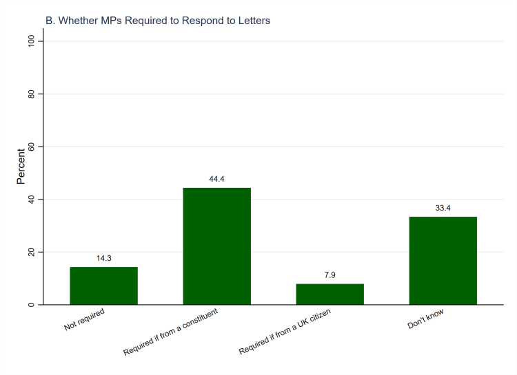 Figure 1 (above, using weighted data) shows that people are generally very familiar with the identities of politicians but less knowledgeable about questions relating to taking political action.[1] When asked whether they could identify a local venue that could host a public meeting (panel A), more than two fifths (46.1%) think that they have an idea of such a place and three in ten (29.8%) definitely know of one. However, a fifth of people (22.6%) either don’t know of such a place or cannot think of one. Further, only one in seven people (14.3%) know that MPs are not required to reply to letters that they receive (even if it is good practice for them to do so), and a full third (33.4%) admit that they do not know. Turning to the task of identifying politicians, people generally fare much better, and almost three quarters (73.7%) can pick their local MP out of a list of names (panel C). Similar numbers could match Theresa May (75.9%, panel G) and John Bercow (76.6%, panel H) to their respective roles (Home Secretary, Speaker of the House of Commons) at the time, whilst nine in ten could match Ed Miliband (92.7%, panel D) and Nick Clegg (92.4%) to their roles (Leader of the Labour Party, Deputy Prime Minister). It was only Justine Greening (panel F) who people struggled to match to her role as International Development Secretary, with two fifths (40.2%) picking the correct answer but a slightly larger percentage (45.5%) indicating that they did not know her role.