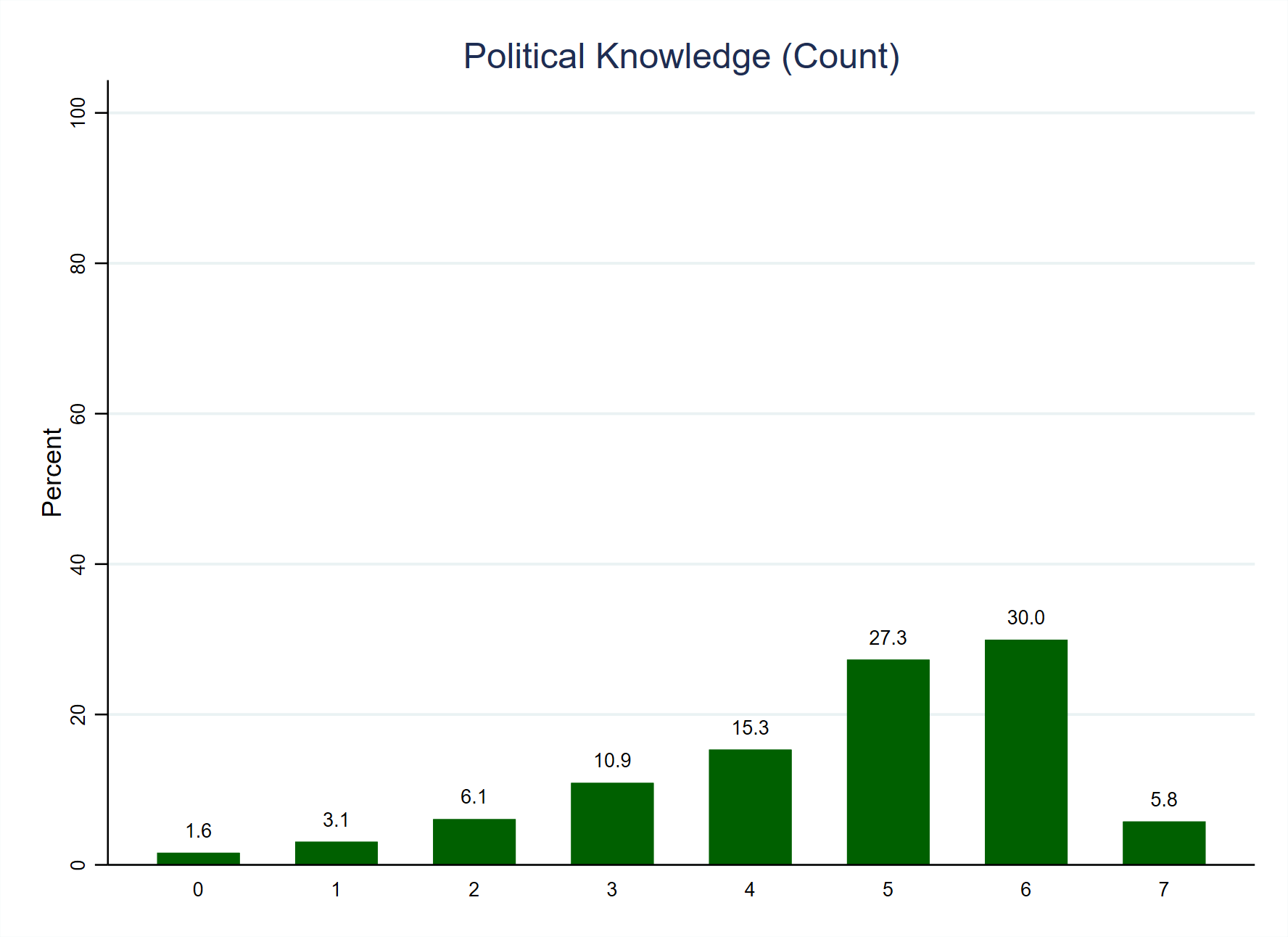 | New and old categories | People who selected the correct answer on each of the original knowledge questions were coded as 1 on the respective new binary variables, whilst all incorrect and ‘Don’t know’ answers were coded as zero. The count variable (indicating how many correct answers were selected) was then calculated by adding the new binary variables together. As such, a zero (0) on the count variable indicates that none of the factual political knowledge questions were answered correctly, whilst a seven (7) indicates that they were all answered correctly. |