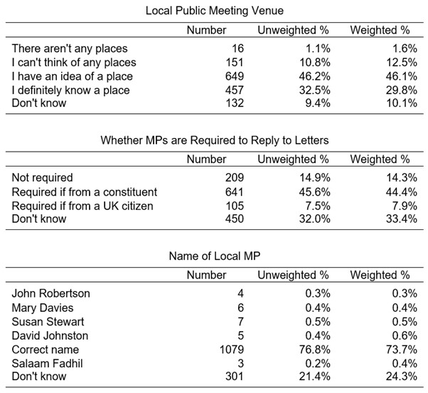 In addition to their appraisals of their own political knowledge, people’s actual political knowledge can also be important for political participation. As with self-perceived political knowledge and understanding (or lack thereof), actual political knowledge (or lack thereof) might motivate (or inhibit) political action. This might be in terms of being able to converse with others about developments in national politics, or in more practical terms relating to things such as writing to elected representatives. In this light, the survey asked people whether they know a local venue that could host a public venue, whether an MP is obliged to respond to letters, whether they could identify their local MP from a list of names, and whether they could match photographs of five prominent politicians to their roles.