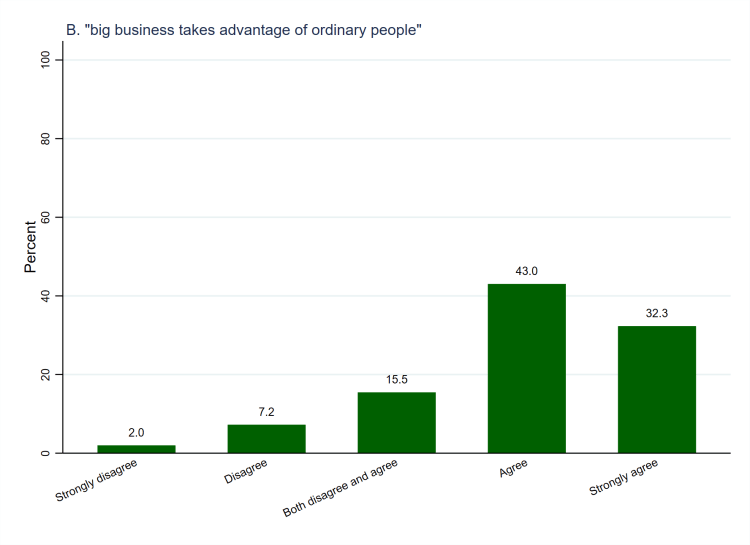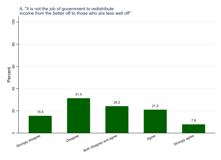 Approaching half of people (46.9%) think that the state should be involved in redistribution (panel A), whilst three in ten (28.8%) who think that it should not. The remaining quarter of people (24.2%) are ambivalent and can see both pluses and minuses to the state being involved in redistribution. This is the ideological belief that people are most evenly divided on. By contrast, three quarters of people (75.3%) agree that big business takes advantage of ordinary people, only one in ten (9.2%) disagree, and the remaining one in six (15.5%) are ambivalent. This is a similarly left-leaning distribution of answers to those relating to all but one of the other economic beliefs: