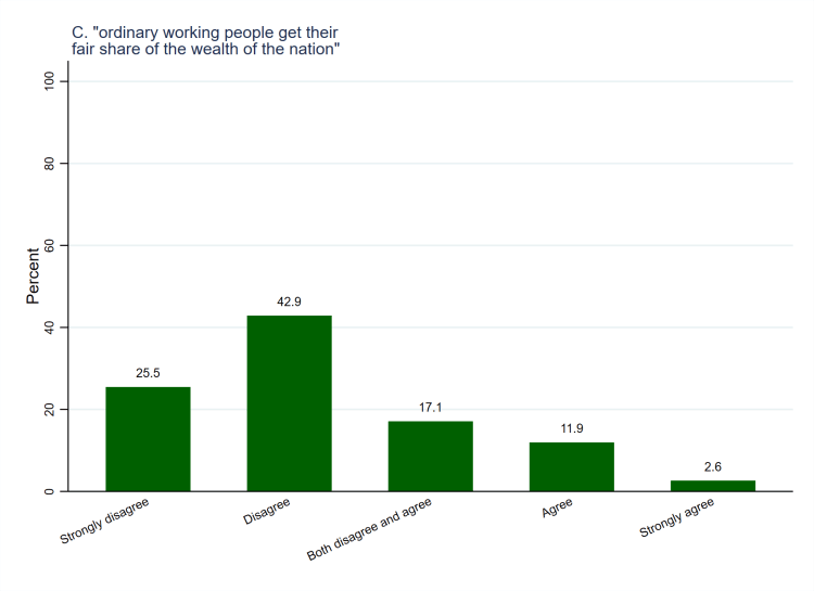 - Two thirds of people (68.4%) think that ordinary working people do not get their fair share of the nation’s wealth (panel C), whilst one in seven (14.5%) think that they do and one in six (17.1%) are ambivalent.
