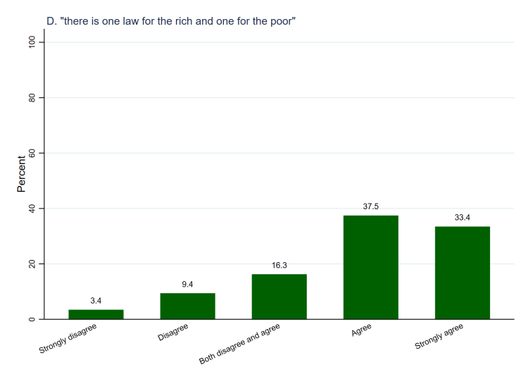 - Seven in ten people (70.9%) think that there is one law for the rich and another for the poor (panel D), one in eight (12.5%) think that there is not, and one in five (18.5%) are ambivalent.