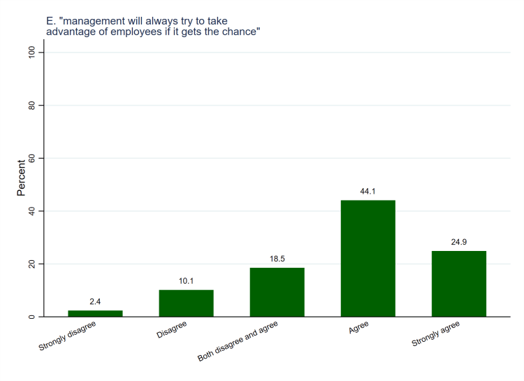 - Seven in ten people (69.0%) think that management always tries to take advantage of employees (panel E) whilst one in eight (12.5%) think that is not the case and one in five (18.5%) are ambivalent.
