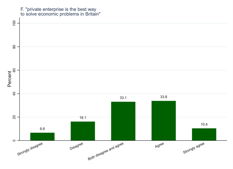 By contrast, there is one economic belief on which people tend towards a right-wing position: the role of private enterprise in the economy. More than two fifths of people (44.2%) think that private enterprise is best placed to solve the country’s economic problems, whilst roughly half as many (22.7%) think that it is not. This leaves a third (33.1%) who can see both sides of the argument, which is the largest ambivalent group relating to any of the economic beliefs, perhaps reflecting the more technical nature of the question.