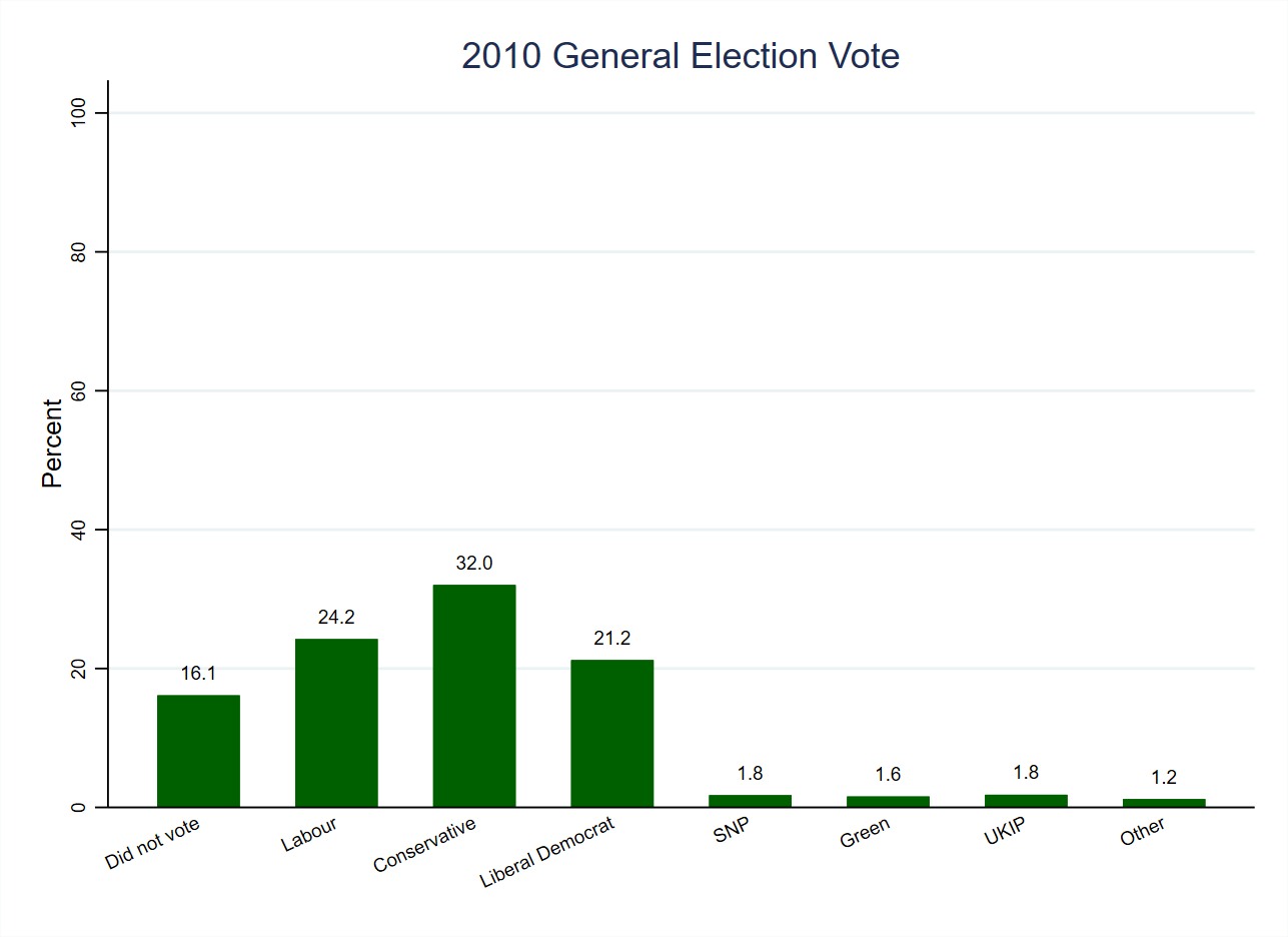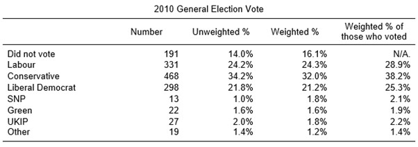 - 28.9% of the sample who voted supported Labour, whilst 29.0% of the population who voted did so in the 2010 general election.