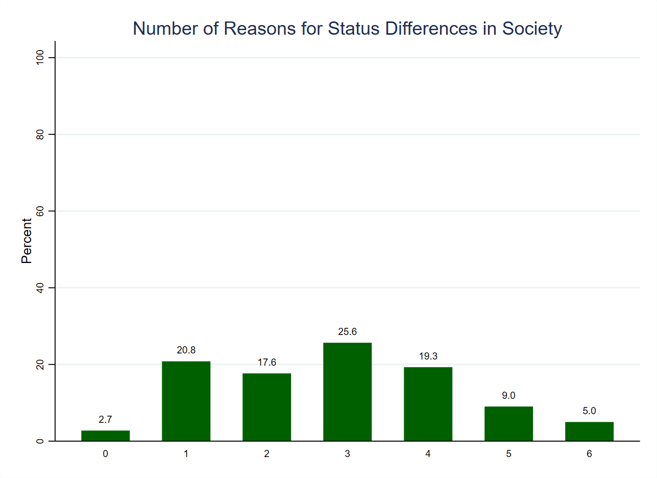 Thus, people tend to entertain multiple explanation for status difference in society but restrict themselves to a few rather than endorsing all or almost all of them. This, and the prevalence of both structural and individual explanations, suggests that at least some people are willing to entertain both kinds of explanation. This can be tested when we look into which explanations tend to be selected by the same people but, in the meantime, we can turn to people’s rankings of the reasons.