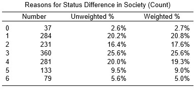 | New and old categories | Category 1 (‘Yes’) on each of the original variables was counted as 1 (i.e. that reason for status difference in society is selected), with category 0 (‘No’) counted as zero. As such, 0 on the new variable indicates no reasons for status difference in society were selected (though these people may have selected ‘other’), whilst 6 indicates that all six of the (substantive) reasons were selected. |