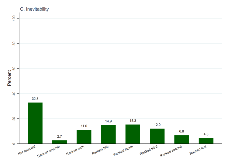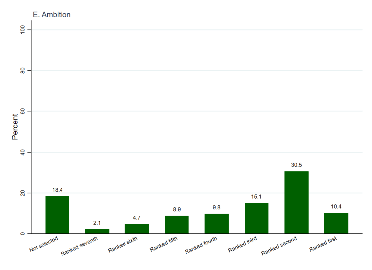 By far the most popular explanation for own status is hard work (panel B), which is ranked as the most important explanation by half of people (50.0%) and in the top three explanations by more than four fifths (81.3%). No other explanation comes close to the popularity of hard work but the second favourite is ambition (panel E), which three in ten people (30.5%) rank second and more than half (56.0%) place in their top three. Background (panel D), which was the most popular explanation for status difference in society, is the third most popular explanation for own status, with approaching half of people (47.1%) placing it in their top three. Two fifths of people (41.7%) rank luck (panel A) in their top three explanations, more than a fifth (23.3%) do so for inevitability (panel C), and the least popular explanation for own status is inequality (panel F), which is ranked in the top three by one in ten people (10.6%).
