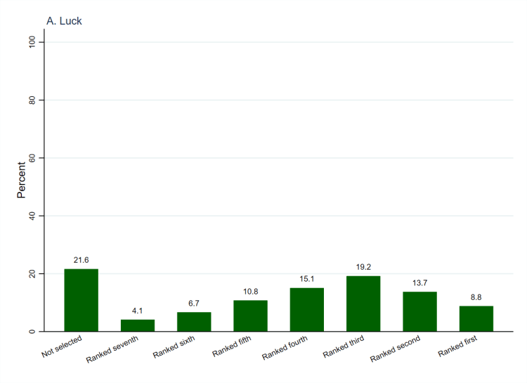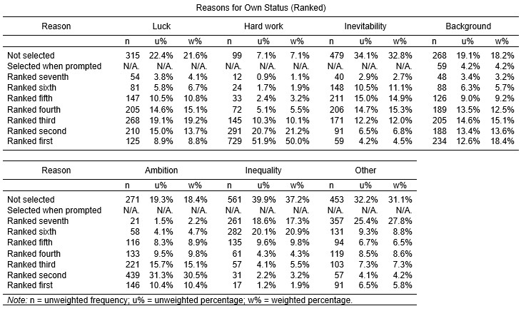 In addition to their beliefs about the reasons for status difference in society, it also matters what people think are the reasons for their own status. Do they prioritise the same explanations for status difference in general as they do for their own status, or do they emphasise different things? After asking them to select and rank their top reasons for status difference in society, the survey asked respondents to rank the same set of reasons as explanations for their own status, picking at least their top three. The results can be seen in Figure 1 (above, using weighted data).[1]