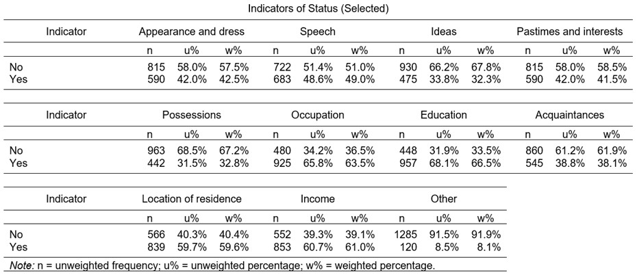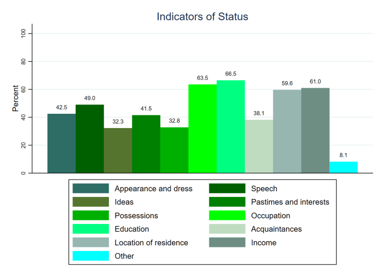 The most popular indicator of status is education, which is selected by two thirds of people (66.5%), and is closely followed by occupation (63.5%), income (61.0%), and location of residence (59.6%). Thus, people tend to opt for the indicators of status that are already used extensively in the study of inequality and in commentaries on society, perhaps in part because those indicators more readily come to mind due to their widespread usage. However, people are far from exclusionary in their selections and almost half (49.0%) select how people speak as an indicator, whilst around two fifths select each of appearance and dress (42.5%), pastimes and interests (41.5%), and who people know (38.1%). Finally, people’s possessions and their ideas are the least selected indicators, but even these are chosen by around a third of people (32.8% and 32.3% respectively).