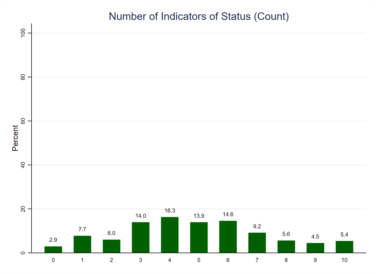 | New and old categories | Category 1 (‘Yes’) on each of the original variables was counted as 1 (i.e. that indicator of status is selected), with category 0 (‘No’) counted as zero. As such, 0 on the new variable indicates that none of the substantive indicators of status were selected (though these people may have selected ‘other’), whilst 10 indicates that all ten of the (substantive) indicators were selected. |