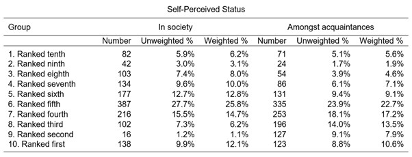 People are roughly normally distributed around the fifth rung when comparing themselves to both groups but, as noted, more people favour higher rungs when compared to acquaintances. However, there are also lower peaks at each end of the scale, representing people who think of themselves as particularly high or low status. In relation to society, one in sixteen people (6.2%) place themselves on the lowest rung and one in eight people (12.1%) place themselves on the highest rung. The groups at each end of the scale are slightly lower when people compare themselves to their acquaintances: one in eighteen (5.6%) place themselves on the bottom run and one in nine (10.6%) place themselves on the top rung. These outlying groups mean that the answers to these questions differ notably from the more normally distributed answers to similar questions that were asked in 2001, 2005, and 2010, and this may indicate a problem.