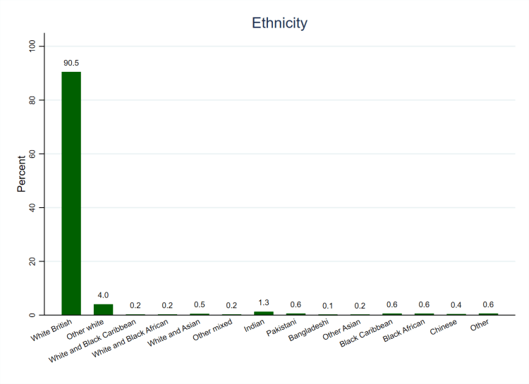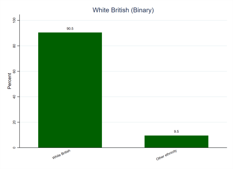 | New and old categories | The original fourteen-category variable was recoded such that all categories except 1 (‘White British’) became 0 (‘Other ethnicity’) in the new variable, whilst category 1 remained as such. |