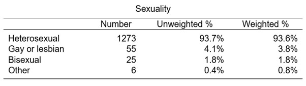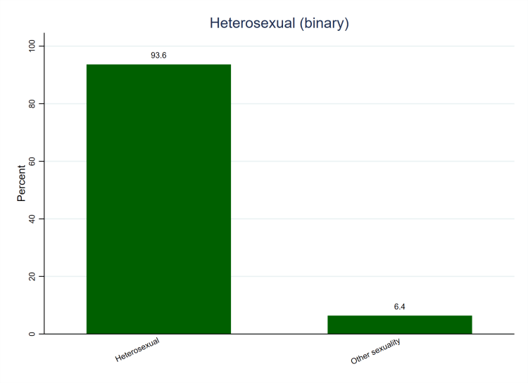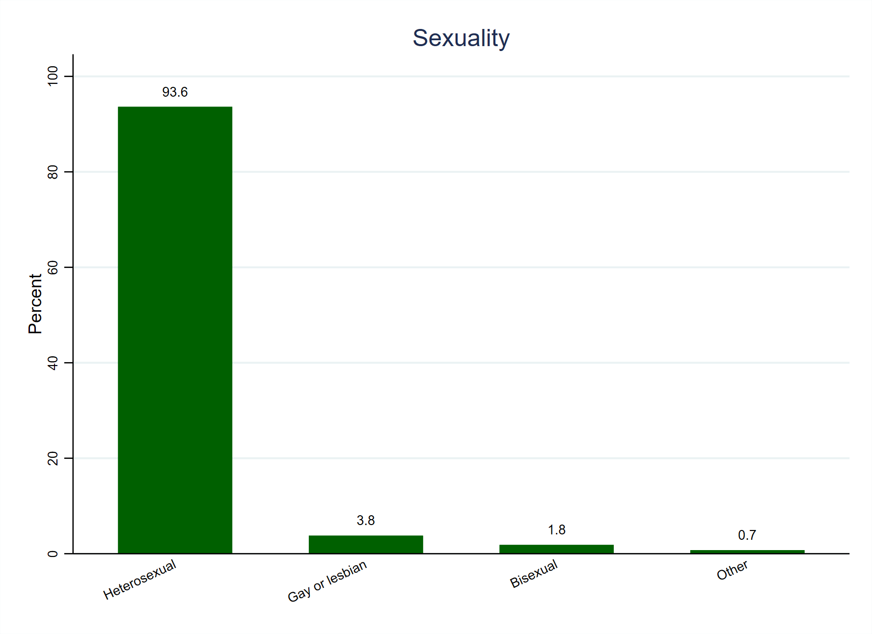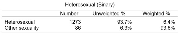 | New and old categories | The original four-category variables was recoded such that categories 2 (‘Gay or lesbian’), 3 (‘Bisexual’), and 4 (‘Other’) became category 0 (‘Other sexuality’) in the new variable, whilst category 1 (‘Heterosexual’) remained as such. |