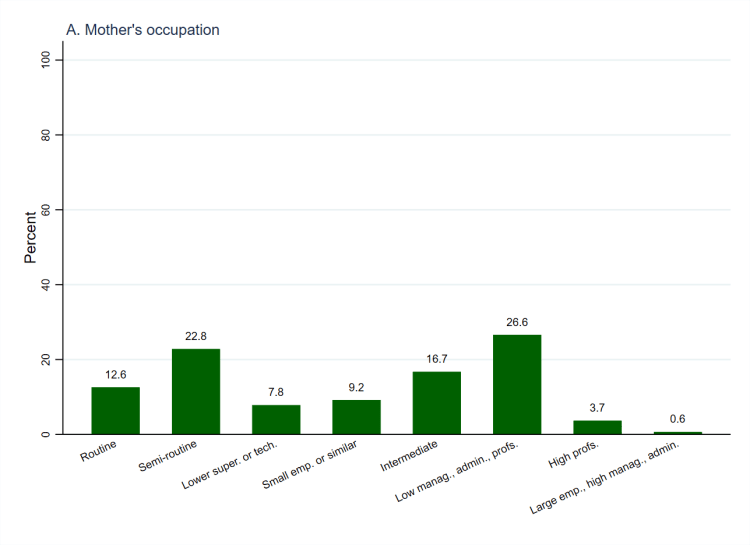 By contrast, more than four fifths of people (81.1%) provided an occupation for their father (panel B), and more than a fifth of those (22.1%) had fathers in lower managerial, administrative, or professional roles. Around one in six people’s (17.0%) fathers were in lower supervisory or technical roles, and one in seven (14.2%) had fathers who were small employers or self-employed. The remainder had fathers in higher professional (13.3%), routine (12.8%), semi-routine (8.6%), intermediate (7.6%), or higher managerial or administrative (4.5%) roles. Thus, amongst those who gave an answer, two fifths (39.9%) had fathers in ‘middle class’ (lower managerial, administrative, and professional; higher professional; large employers and higher managerial or administrative) occupations. A further fifth (21.8%) had fathers in intermediate occupations (intermediate; small employer or self-employed), and the remaining two fifths (38.4%) had fathers in ‘working class’ occupations (lower supervisory or technical; semi-routine; routine). By contrast, amongst those who gave an answer, less than a third (30.9%) had mothers in ‘middle class’ occupations, a quarter (25.9%) had mothers in intermediate occupations, and more than two fifths (43.2%) had mothers in ‘working class’ occupations. Thus, people’s dads were more likely to be in ‘middle class’ occupations than their mums were.